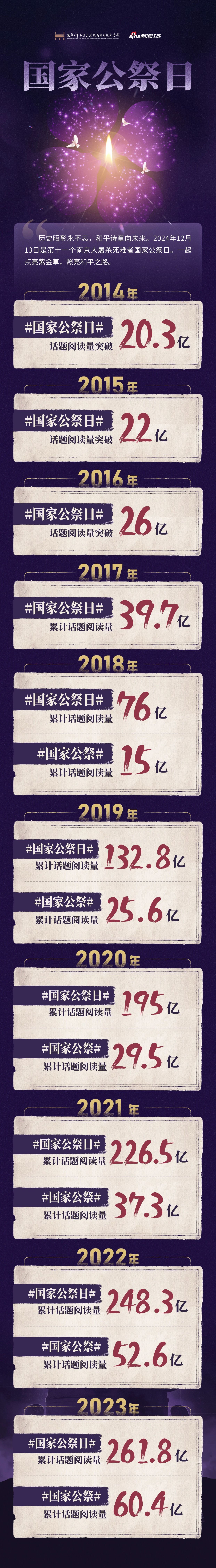 纪念馆官方微博#国家公祭#和#国家公祭日#双话题阅读量从2014年20.3亿递增至2023年322.2亿。