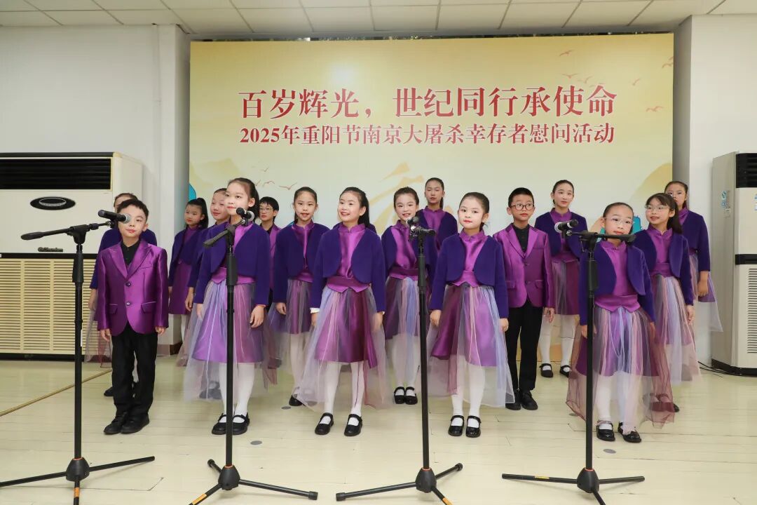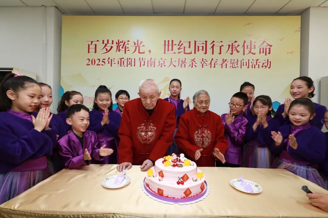 王义隆、薛玉娟是目前最年长的幸存者。幸存者的百年人生,是一部与民族命运紧密交织的史诗。他们以坚韧的生命力量,亲历并见证了中华民族从沉沦到奋起的伟大跨越,他们既是南京大屠杀历史的“活证人”,更是中国人民抗日战争胜利的“见证者”。两位老人与家属、纪念馆工作人员围坐一堂,紫金草童声合唱团以《和平的童谣》拉开寿宴序幕。当《我和我的祖国》旋律响起,两位老人挥舞小国旗,眼中闪烁泪光。