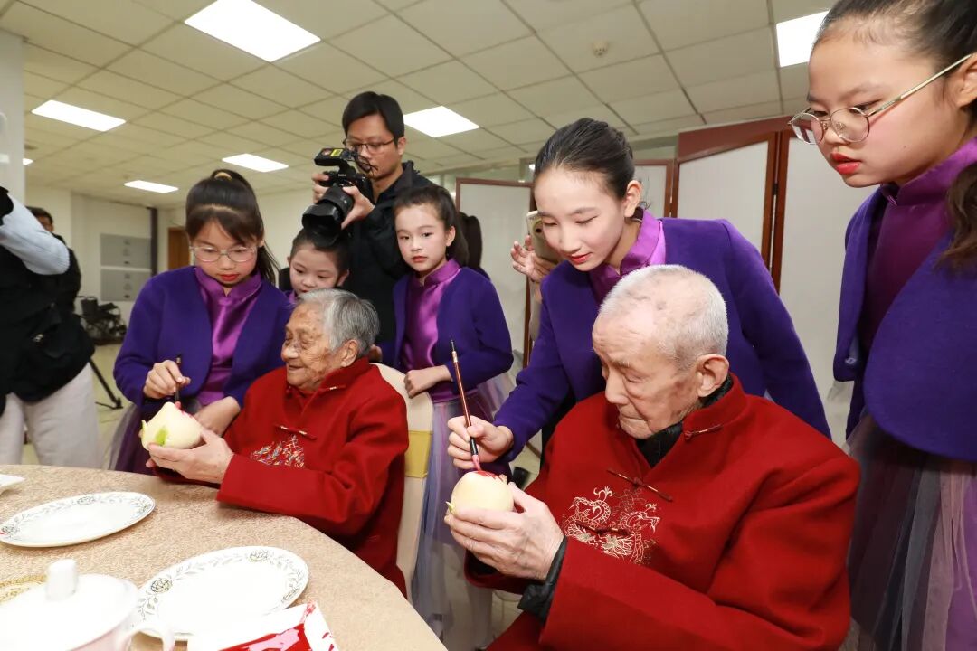 孩子们围拢过来,和老人一同在寿桃上描画“寿”字,祝愿老人福寿绵长、安康幸福。