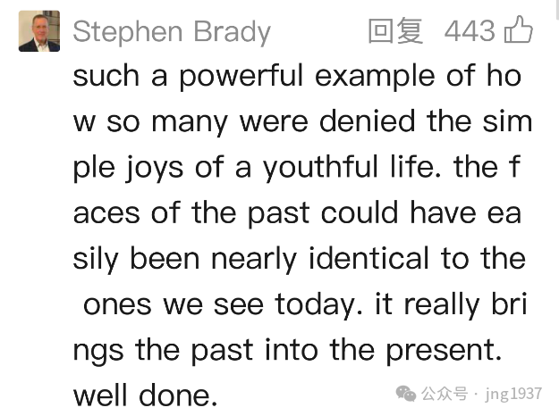 国际友人理查德·布莱迪之孙史蒂芬·布莱迪留言:“这是一个极具说服力的例证:无数人被剥夺了年轻生命的平凡幸福。历史长河里那些逝去的面庞,或许与我们今日所见的面容相差无几。它真切地让历史与当下交汇共鸣。做得很好。”