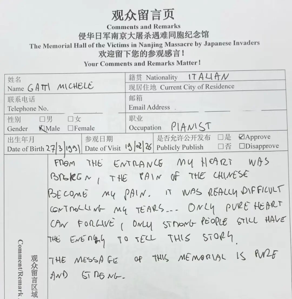 来自意大利的钢琴家写道:“从入口处,我的心备受煎熬。中国人的痛苦也成了我的痛苦,难以控制我的眼泪。……唯有坚强的人才有力量讲述这样的故事。这座纪念馆传递的讯息是纯粹的、给予人力量的。”