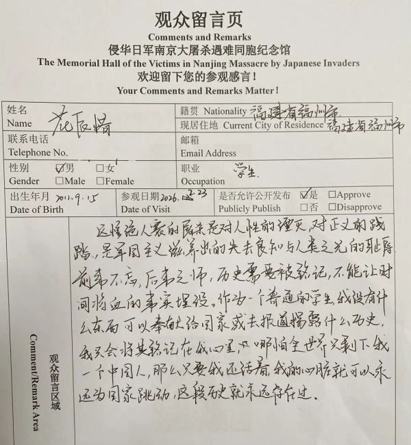 青少年观众在参观之后有了更多思考。“这惨绝人寰的屠杀是对人性的湮灭,对正义的践踏,是军国主义滋养出的失去良知与人类之光的耻辱……”来自福建福州的15岁花同学写下留言,笔迹清秀,情感炽烈。