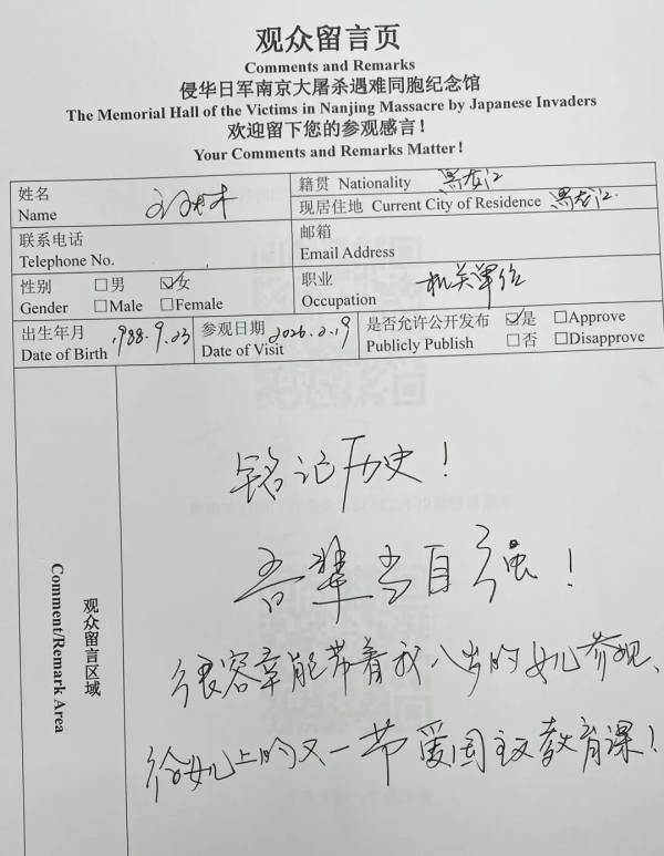 一名来自黑龙江的母亲写道:“很荣幸能带着我八岁的女儿参观,给女儿上的又一节爱国主义教育课!”