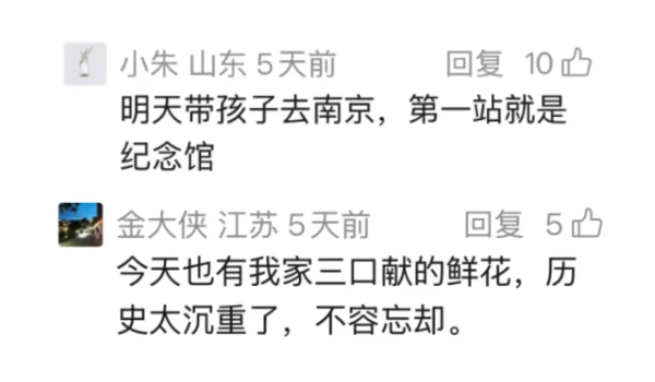 外国观众Alessia留言:“令我们深受触动的是,展览展现了那段罪恶的历史,也是向世界发出呼唤和平的邀请。这是历史给予我们最珍贵的启示。向中国及中国人民致以崇高敬意。”