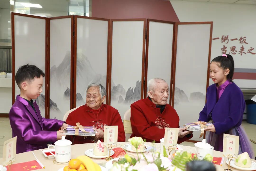 王义隆、薛玉娟是目前最年长的幸存者。幸存者的百年人生,是一部与民族命运紧密交织的史诗。他们以坚韧的生命力量,亲历并见证了中华民族从沉沦到奋起的伟大跨越,他们既是南京大屠杀历史的“活证人”,更是中国人民抗日战争胜利的“见证者”。两位老人与家属、纪念馆工作人员围坐一堂,紫金草童声合唱团以《和平的童谣》拉开寿宴序幕。当《我和我的祖国》旋律响起,两位老人挥舞小国旗,眼中闪烁泪光。