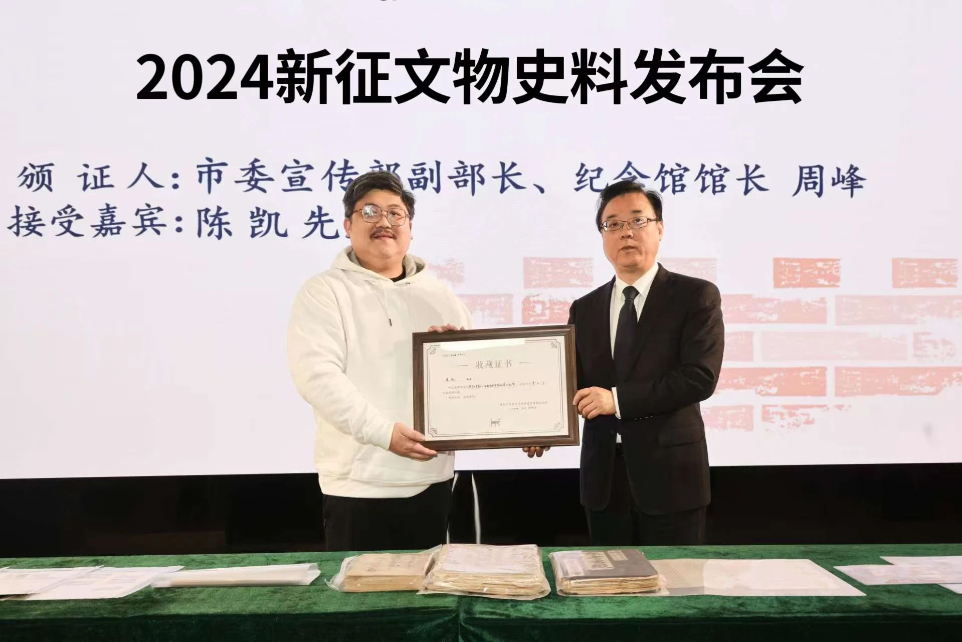 纪念馆馆长周峰向捐赠人陈凯颁发收藏证书