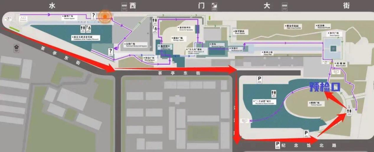 如您同时预约南京大屠杀史实展区和“三个必胜”专题展区,参观南京大屠杀史实展区后,按下列图示从7号门出展区,进入预检口。