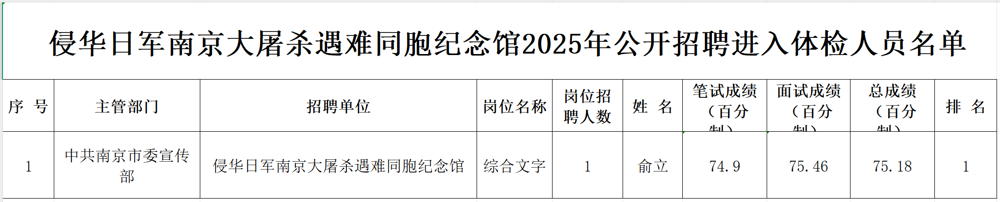 侵华日军南京大屠杀遇难同胞纪念馆2025年公开招聘进入体检人员名单