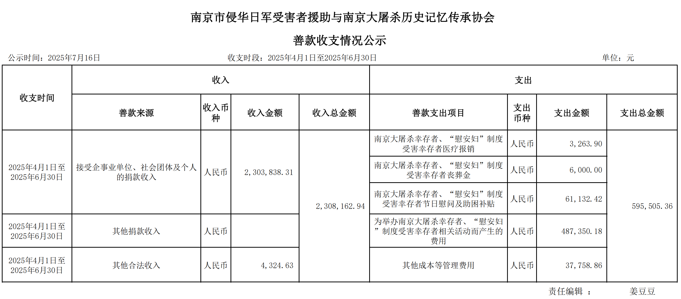 南京市侵华日军受害者援助与南京大屠杀历史记忆传承协会善款收支情况公示