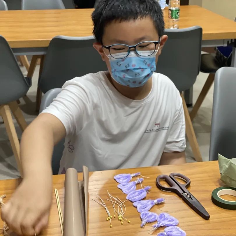 制作完成后,孩子们迫不及待地与紫金草合影。苏煜钦同学说:“这是我第一次了解绒花这项非遗文化,我会把它带回去,与好朋友分享。”