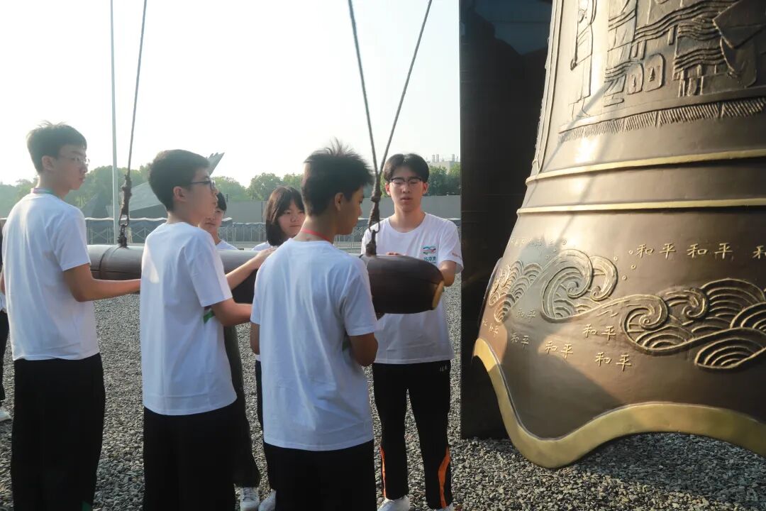 在公祭广场,港澳学生举行升国旗仪式。学生们凝视着冉冉升起的五星红旗,齐声唱响国歌。这一刻,仪式的庄严感扑面而来,家国情怀在心中激荡。随后,12名师生代表撞响和平大钟,钟声悠远,寄托着对历史的铭记与对和平的珍视。