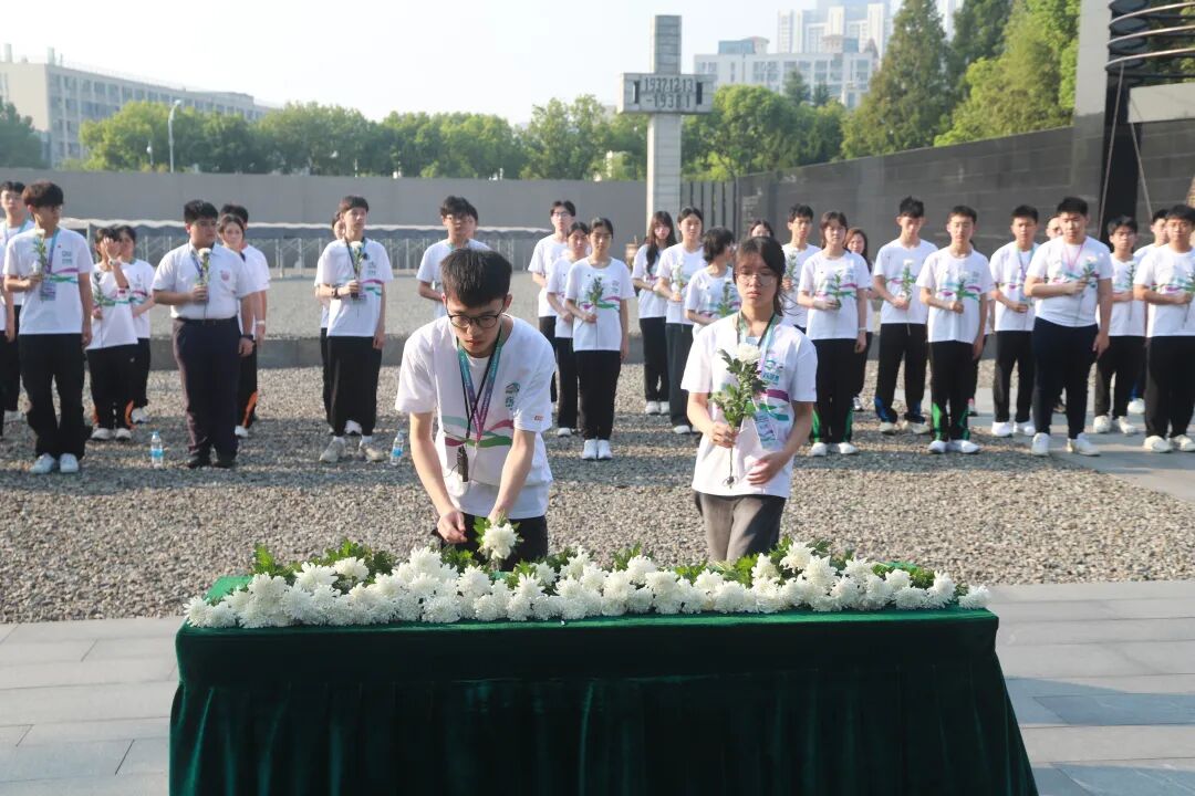 学生们在“古城的灾难”广场列队肃立,向南京大屠杀死难者默哀、献花,缅怀遇难同胞。