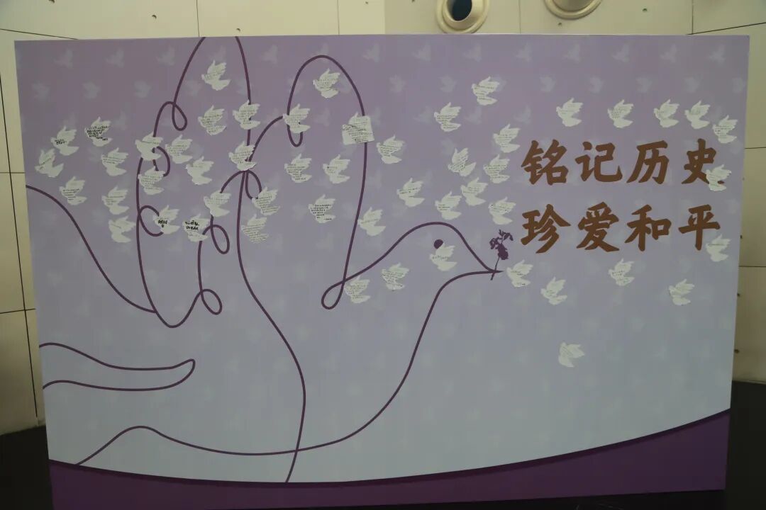 参观临近尾声,学生们纷纷驻足在和平鸽花语墙前,写下参观感悟。