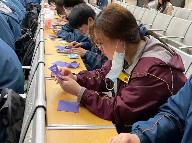 中午,他们跟随我馆工作人员动手折叠和平之花紫金草,一叠、二折、三翻转......很快,一张张紫色纸片就变成了一朵朵象征和平与希望的紫金草。