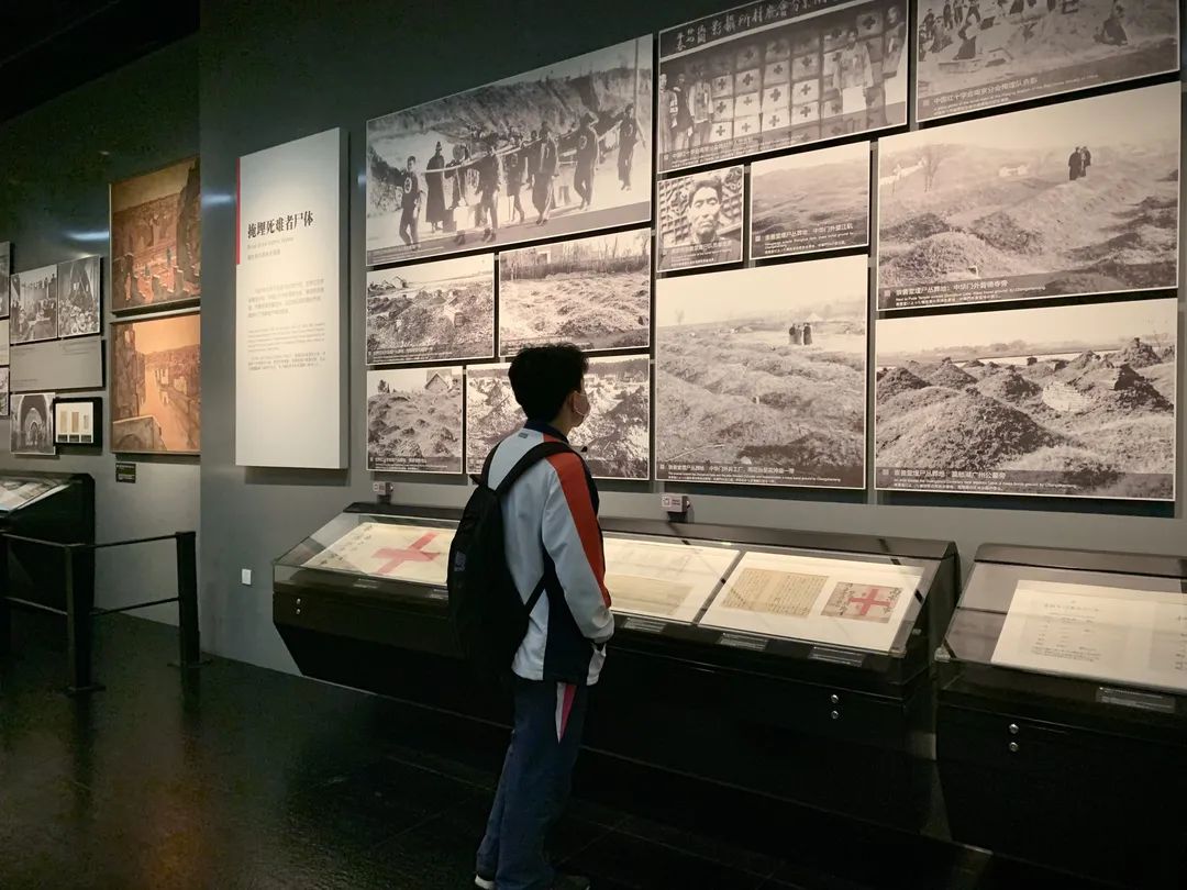 “我是邾永康,刚走进侵华日军南京大屠杀遇难同胞纪念馆,展厅的氛围一下子把我拉进了那段历史中。种种记载着证明日本罪行的照片、影像、文字资料在微弱的光线下,无声地诉说着真相。尤其是我看到史料陈列厅里巨大的“黑匣子”时(2007年我馆三期工程扩建时所发现的一个小型遗骨坑,我馆对其进行了原址原貌的展示。),我看到一副遗骸的头骨都碎裂了,不敢想象他当时受到了怎样的暴行。我听着纪念馆里播放着的对南京大屠杀幸存者的采访视频,回顾当年发生在南京惨绝人寰的历史。我深刻体会到了南京沦陷后普通百姓的绝望与无奈,深思和平来之不易。”