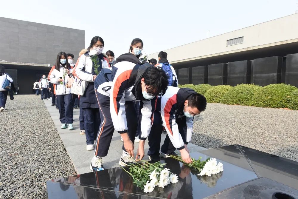 最后,同学们在祭台上向遇难同胞深深默哀、敬献白菊,为此行留下了深刻的情感积淀。