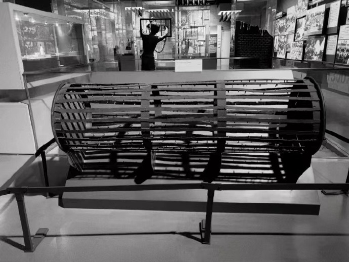 来自高三B班的黄韬略告诉小编,他对“三个必胜”专题展区的圆筒形刑具印象最为深刻。这是一个长长的圆形铁笼,这个铁笼整体呈圆柱形,中空,笼内壁镶满锋利的钉刺。一旁的展板上写着:侵华日军用刑具“滚地笼”。据了解,当年,侵华日军把他们认为的“犯人”衣服剥光,塞进笼内,然后就在地上滚动笼子,笼子里的人被铁刺扎得皮开肉绽……