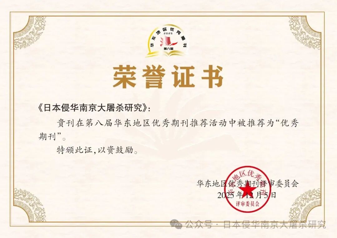2025年5月,《国家哲学社会科学文献中心最受欢迎期刊报告(2024年度)》在京发布,《日本侵华南京大屠杀研究》杂志获“历史学最受欢迎期刊”(共五种)。