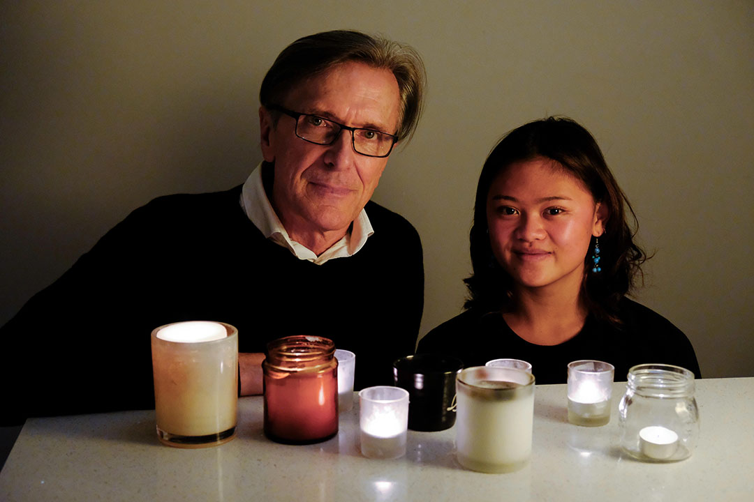 They are the grandson and great-granddaughter of Dr. Richard Brady who stayed at Drum Tower Hospital in Nanjing during the massacre. They were holding white candles to mourn the dead. "We are sending you thoughts of Love and Peace on this day and always." Stephen Brady wrote in an email.