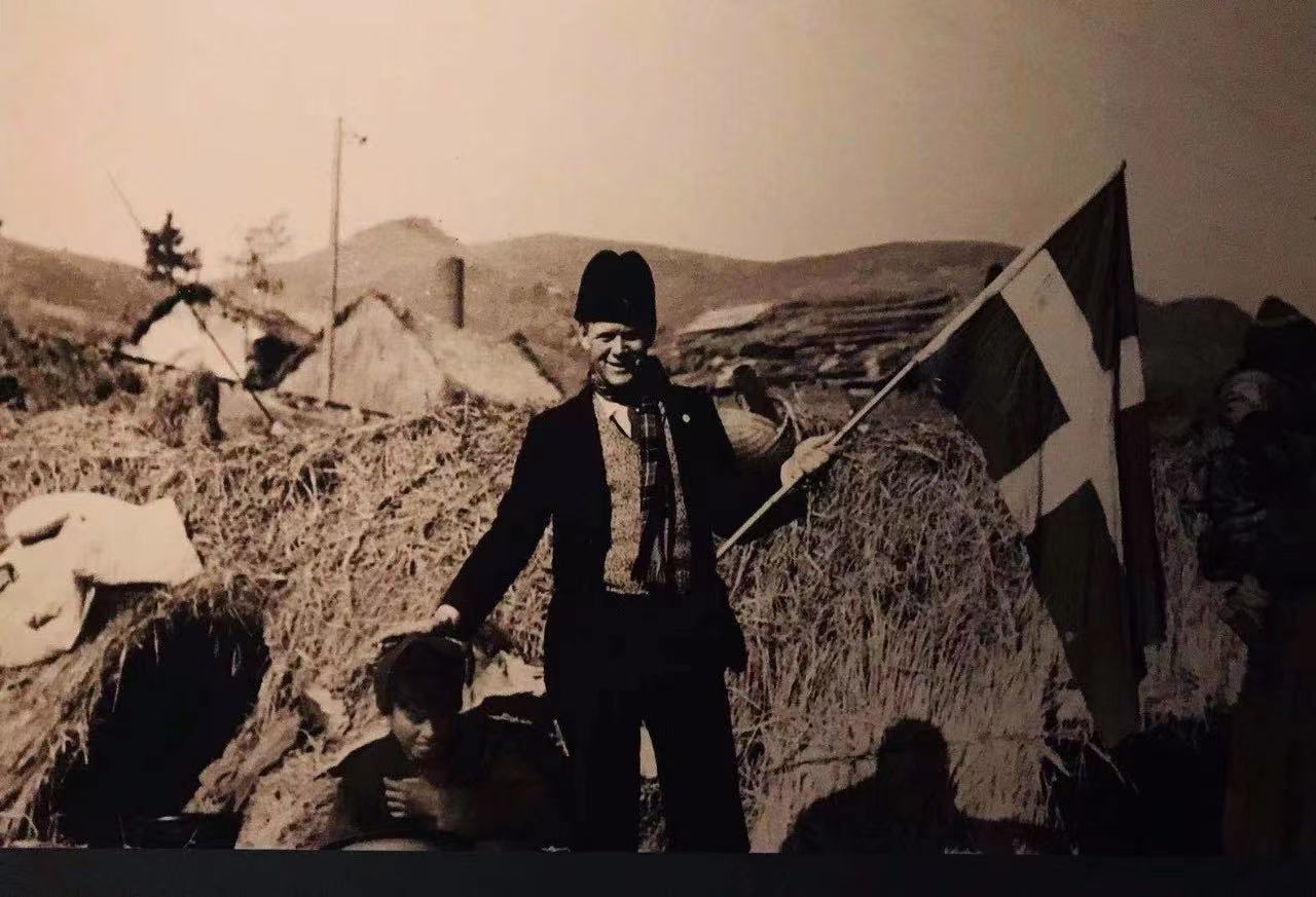 Sindberg held a Danish flag at the Kiangnan Cement Factory refugee camp