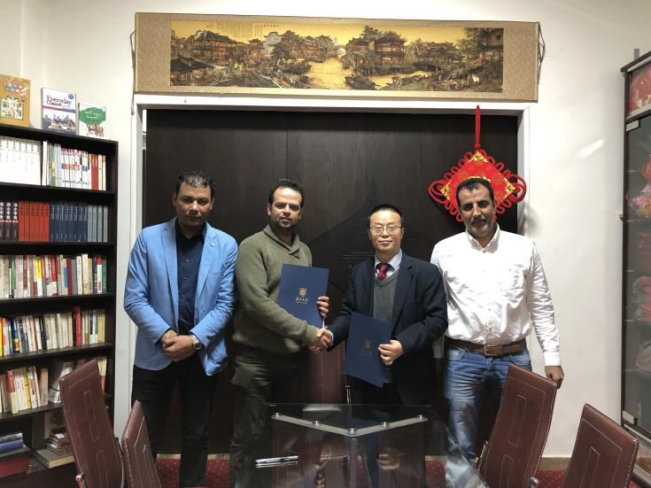 Yang Jinrong (second from right) signs a contract for the publication of the Nanjing Massacre History in Arabic in Cairo, Egypt