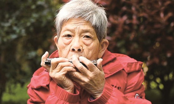 Survivor of the Nanjing Massacre Cheng Wenying learns how to play the harmonica