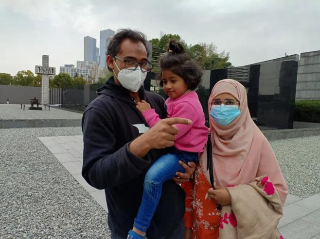 Yumnah Babar (Chinese name: Yunna) from Pakistan and her husband heard of the Nanjing Massacre from her elder sister. “When my elder sister came to study in China five years ago, she visited the Memorial Hall. She told us about the history when she returned to Pakistan.” This was the first time the couple took their little daughter Sohaye Usman to the Memorial Hall. “I feel very sad. We will let more people know about the history when we return to Pakistan one day,” she said.
