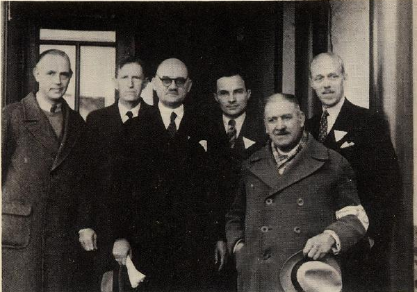 A group photo of some Western people staying in Nanjing: Ernest Forster (first from left), Wilson Plumer Mills, John Rabe, Lewis Smythe, Eduard Sperling, and George Ashmore Fitch