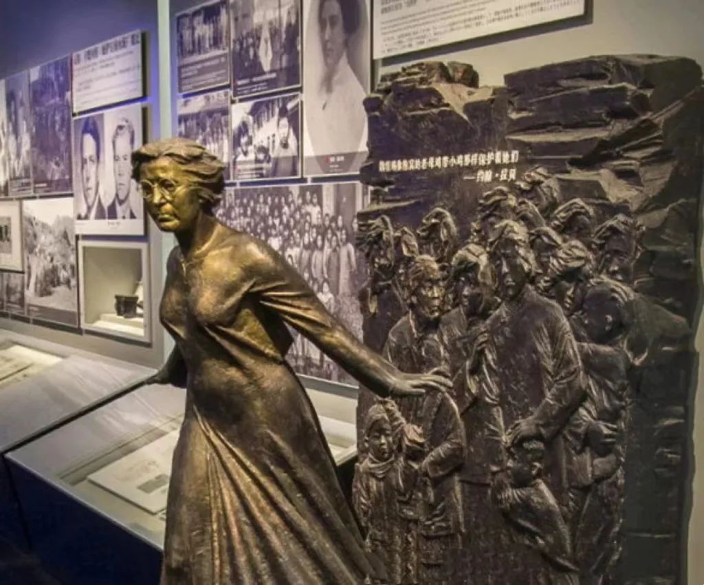 Standing in the historical material exhibition hall of the Memorial Hall is a bronze statue of Minnie Vautrin, showing her as stretching her arms to protect the terrified Chinese women and children behind her. Engraved above the bronze statue is a quote from the German friend John Rabe, chairman of the International Committee of the Nanjing Safety Zone at the time: “Minnie Vautrin protects them (refugees) like an old brooding hen protecting chicks!”