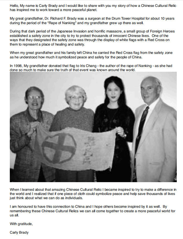 On the eve of the International Day of Peace this year, the Memorial Hall received a letter from Carly Brady, great-granddaughter of Richard Brady, who stayed in Nanjing to help save the refugees during the Nanjing Massacre. In her letter, Carly shared the story behind her family’s connection to Nanjing, and how that has inspired her to work for peace. In the end, she expressed her hope for a peaceful world.