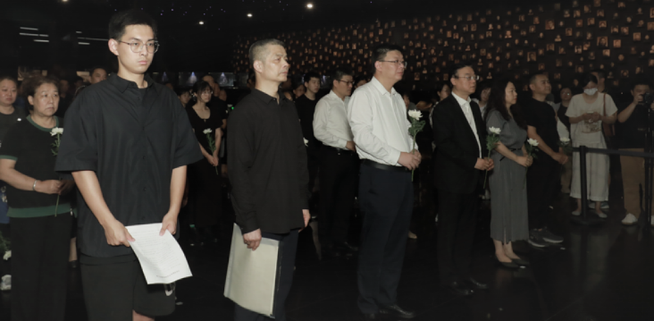 Inside the Prologue of Nanjing Massacre Exhibit, the entire wall is adorned with photographs of 1,213 survivors of the Nanjing Massacre, collectively composing a scene called “The Gaze of History.” Directly across from this installation is a wall featuring 100 symmetrically arranged color photographs of living survivors registered by the end of September 30, 2017. Whenever a survivor passes away, the corresponding lightbox on the photo wall is extinguished. As the ceremony commenced, participants, each holding a white chrysanthemum, solemnly watched as five more faces on the Memorial Hall’s photo wall turned black and white. The attendees paid their final respects to the late survivors with three reverent bows towards their images. Thereafter, they sequentially presented flowers as an act of remembrance and tribute.