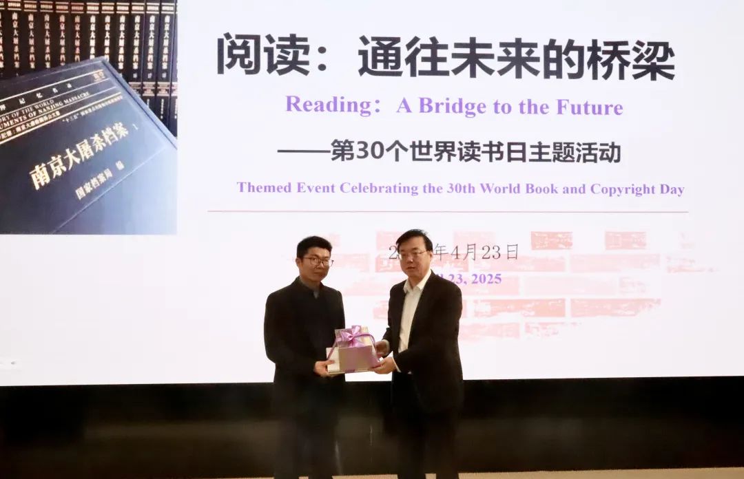 Zhou Feng, the director of the memorial hall, presents historical books to Nanjing Foreign Languages School.