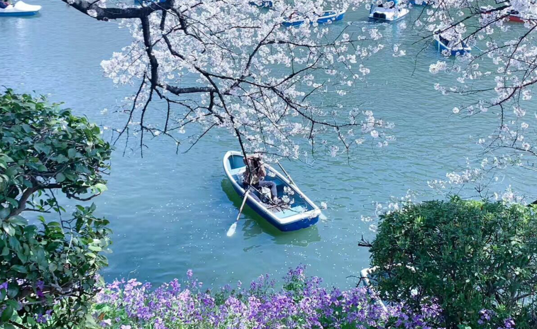 正在日本东京采访侵华日军老兵东史郎的南京电视台记者陈正荣,也抽了个空,走进东京的北之丸公园赏樱。池塘边,一株株洁白似雪的樱花树下,一簇簇紫色小花也在怒放着,其绚烂丝毫不落樱花半分。