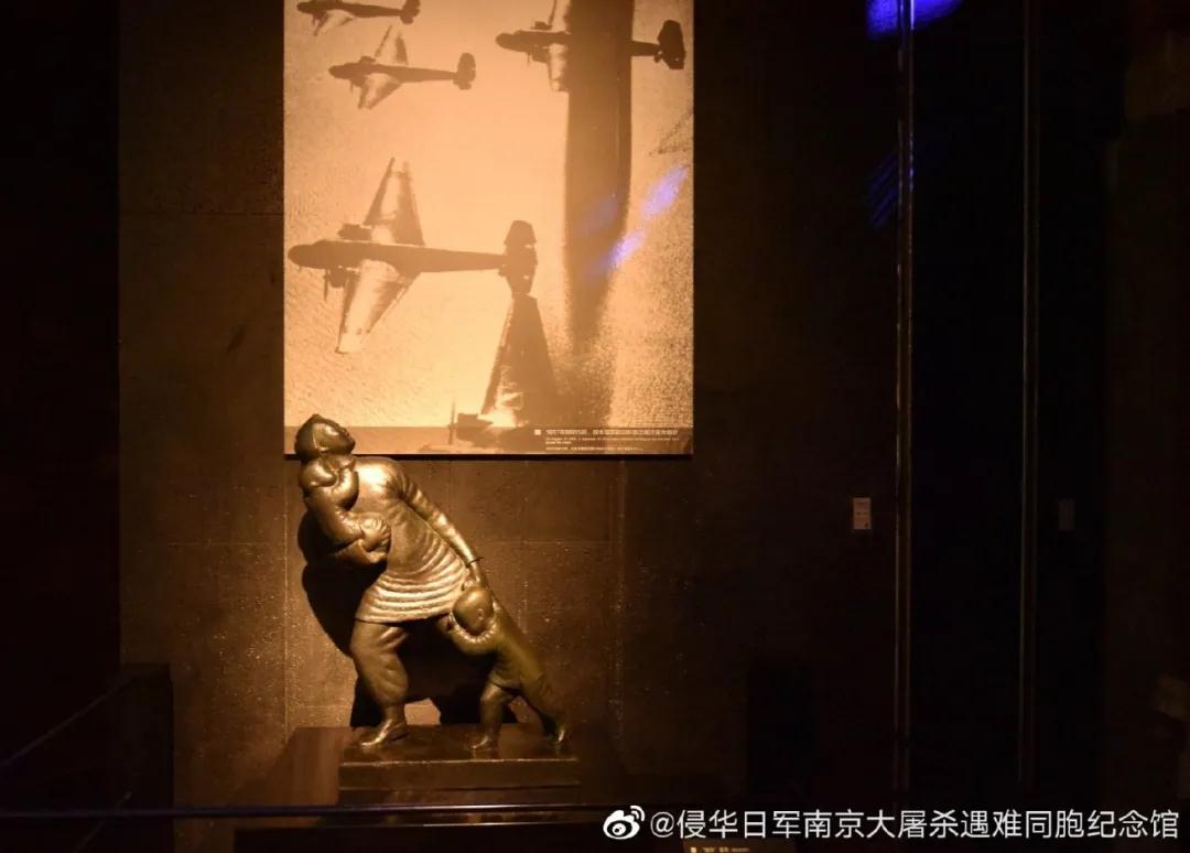 在我馆《南京大屠杀史实展》第一部分轰炸场景下,有一尊《轰炸》雕塑:年轻的母亲回首眺望天空中狂吼的飞机,右手紧搂着未满周岁的婴儿,左手拉着几岁大的儿子,在惊惶中奔走,躲避日军的狂轰滥炸。这尊雕塑由我国现代雕塑事业的开拓者之一、中央美术学院雕塑系主任滑田友创作。