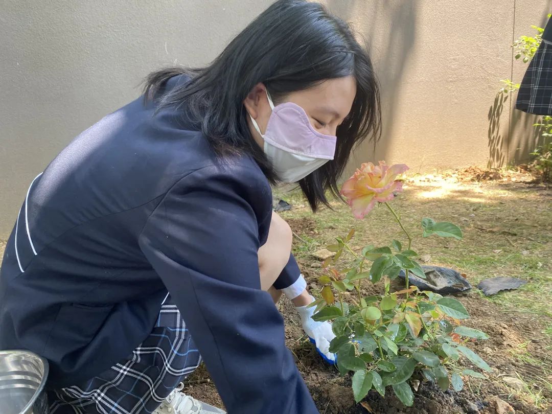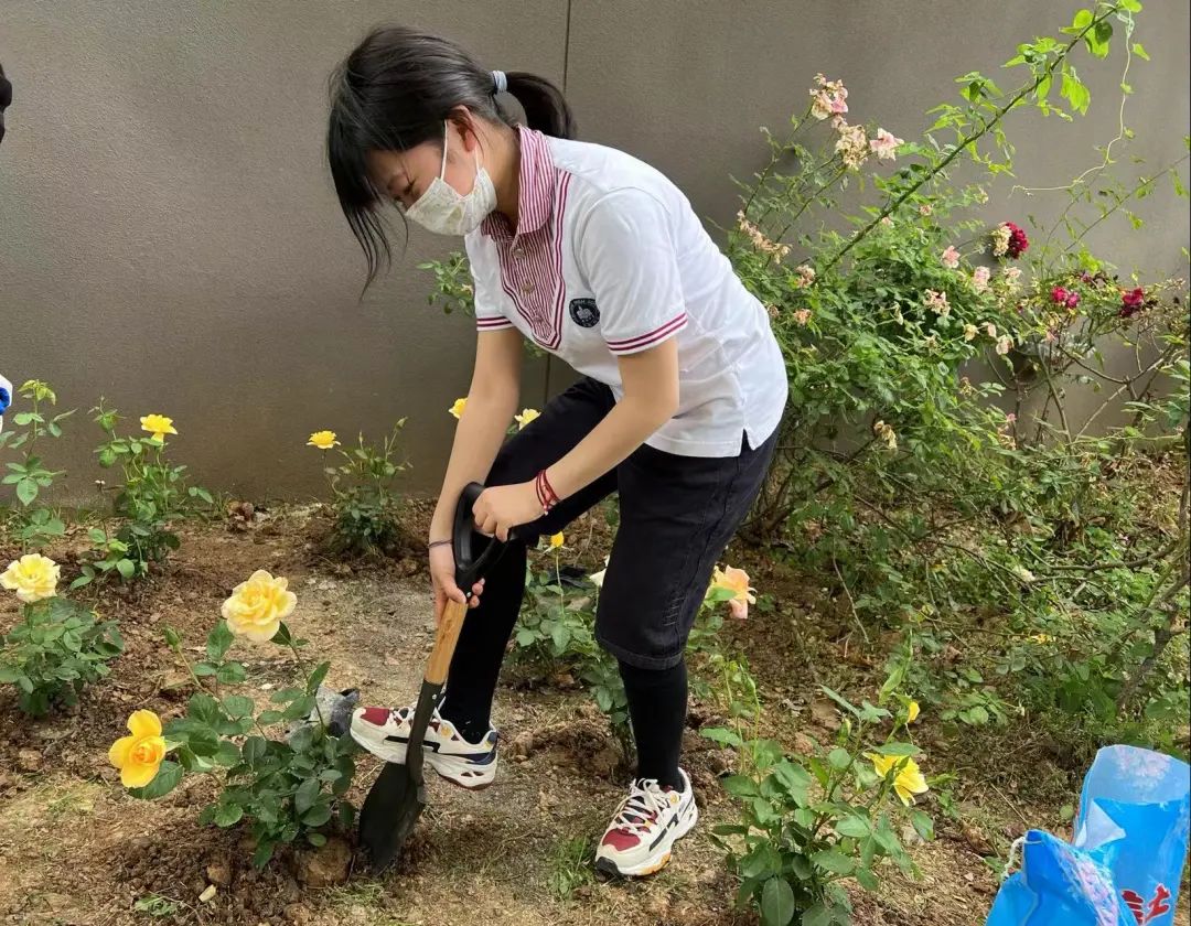 挥锹铲土、培土围堰、提水浇灌……同学们用步数丈量种植间距,认真细致地栽种每一株辛德贝格黄玫瑰,用劳动诠释对生命的关爱,感恩辛德贝格在南京大屠杀期间对难民的庇护。