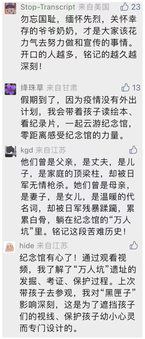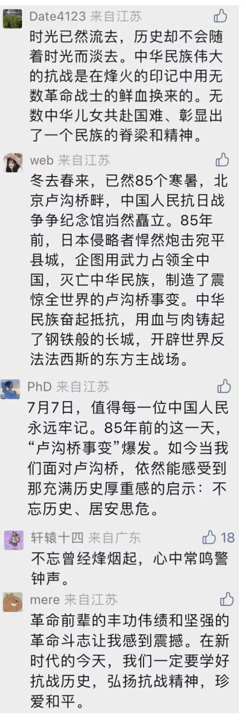 7月7日,纪念馆举行“纪念全民族抗战爆发85周年”主题教育活动。南京市青少年代表朗诵抗战诗文,全体人员依次敬献鲜花。随后,南京大屠杀幸存者后代代表、纪念馆馆员、讲解员在史实展中接力讲述历史故事。“以史为鉴,才能开创未来”、“心中常鸣警钟声”……网友纷纷留言。