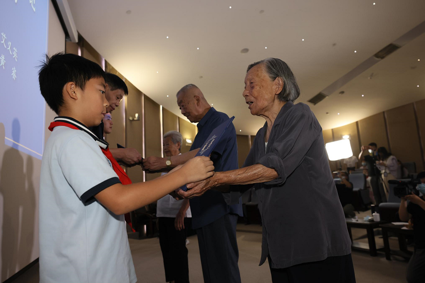 仪式上,纪念馆颁发首批“南京大屠杀历史记忆传承人”证书。南京大屠杀幸存者夏淑琴的外孙女夏媛、曾外孙李玉瀚,幸存者葛道荣的儿子葛凤亮,幸存者艾义英的儿子黄兴华、孙子黄睿等13位幸存者后代,分别从幸存者夏淑琴、葛道荣、艾义英等手中接过证书。这意味着,幸存者后代们正式接过接力棒,未来将肩负起接续传承南京大屠杀历史记忆的重任。