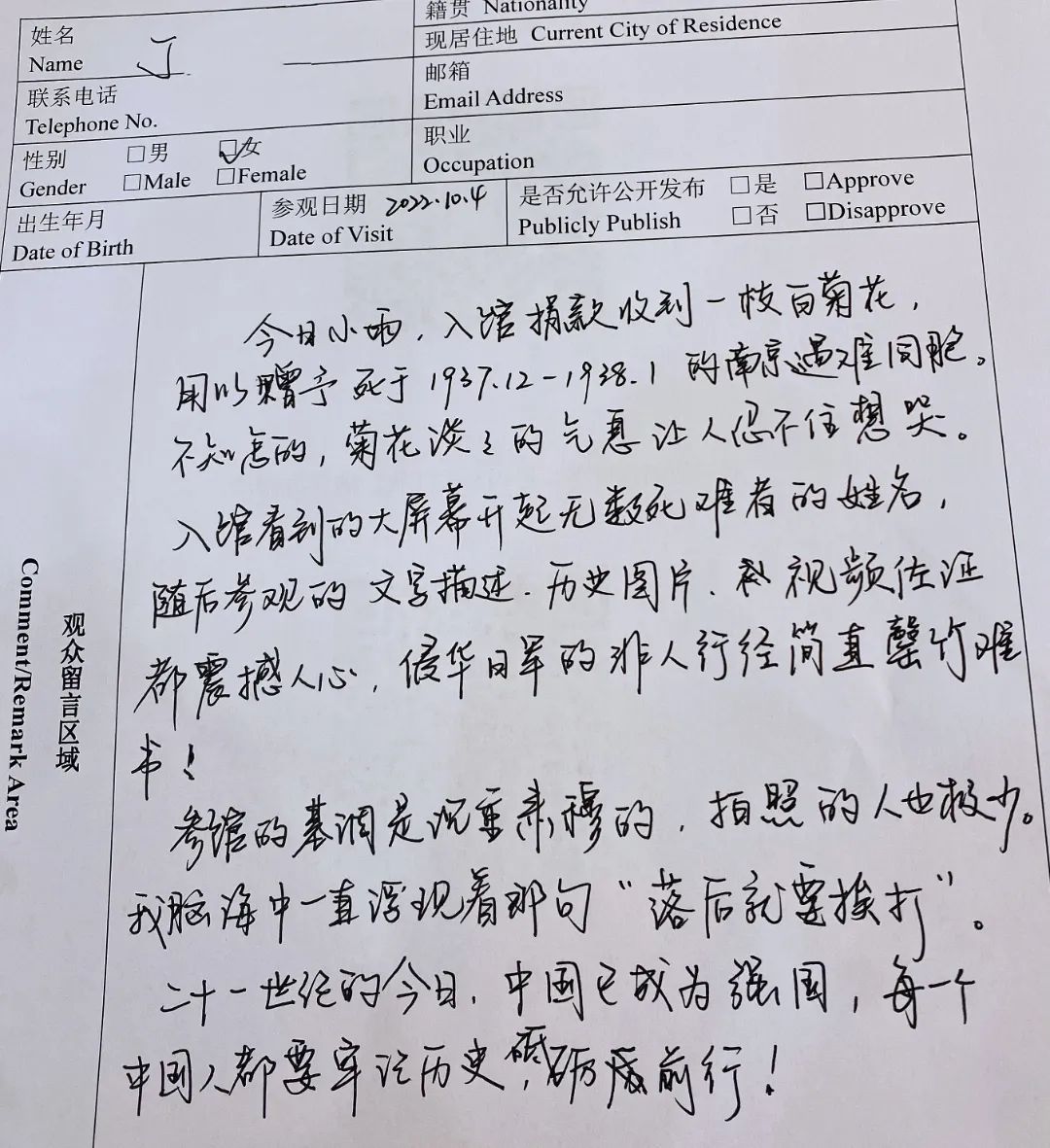 “今日小雨,入馆捐赠收到一支白菊花,用以赠予南京大屠杀遇难同胞……纪念馆的基调是沉重肃穆的,拍照的人也极少,我脑海中一直浮现着那句‘落后就要挨打’。二十一世纪的今日,中国已成为强国,每一个中国人都要牢记历史、砥砺前行!”