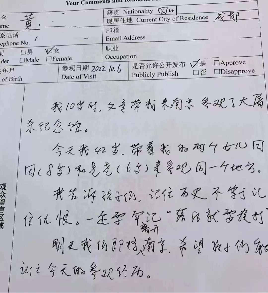 “我10岁时,父亲带我来南京参观纪念馆。今年我42岁,我带着两个女儿来参观。我告诉孩子们,记住历史不等于记住仇恨,一定要牢记‘落后就要挨打’!明天我们即将离开南京,希望孩子能记住今天的参观经历。”