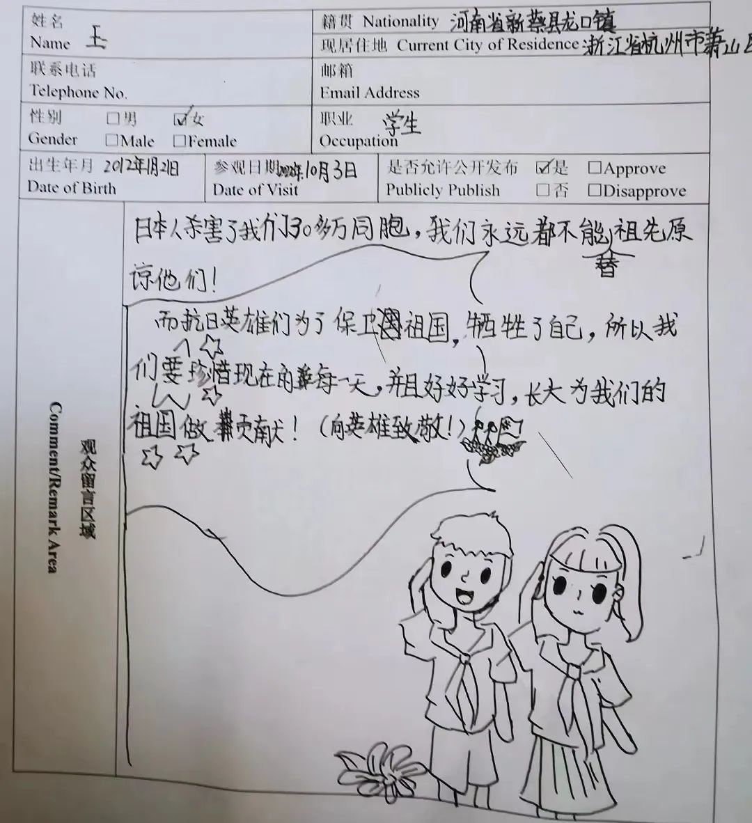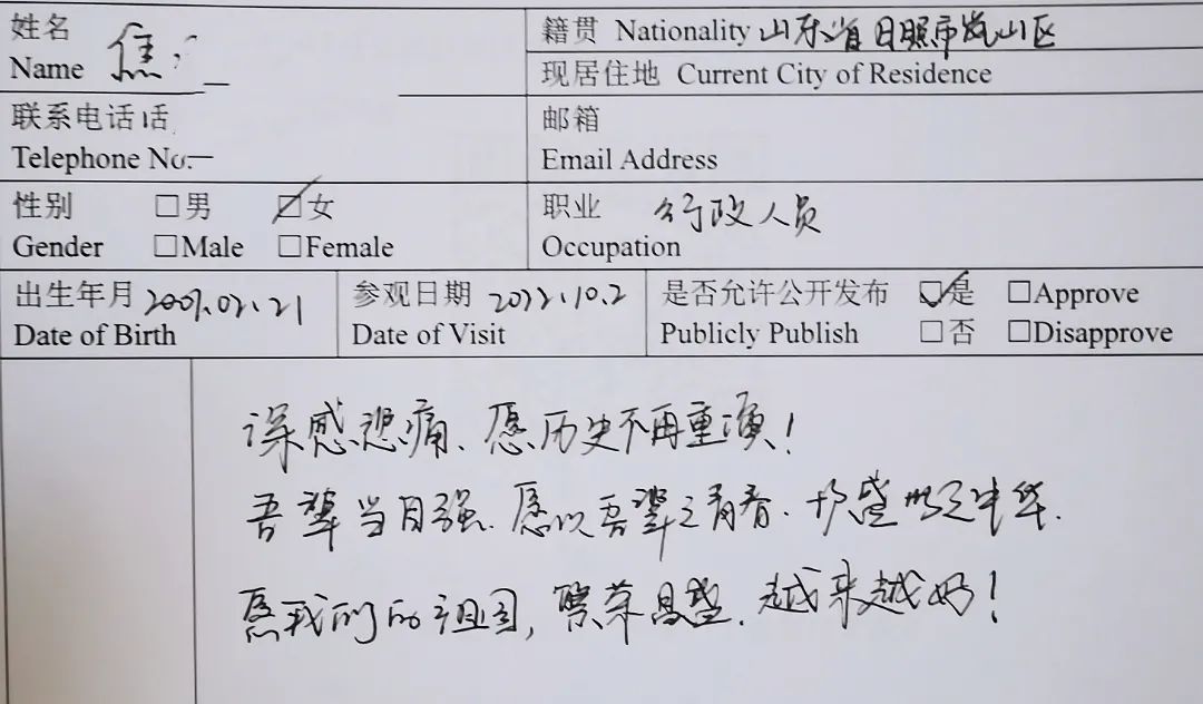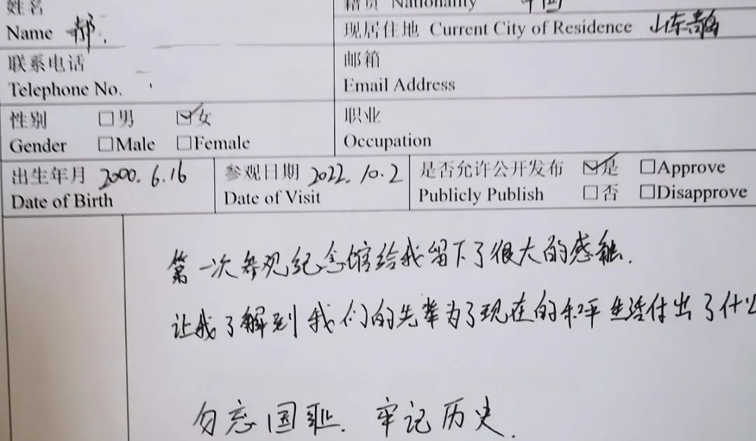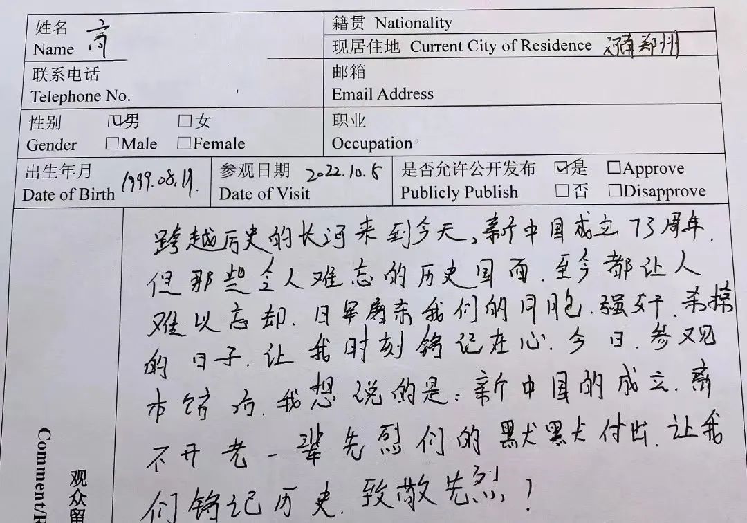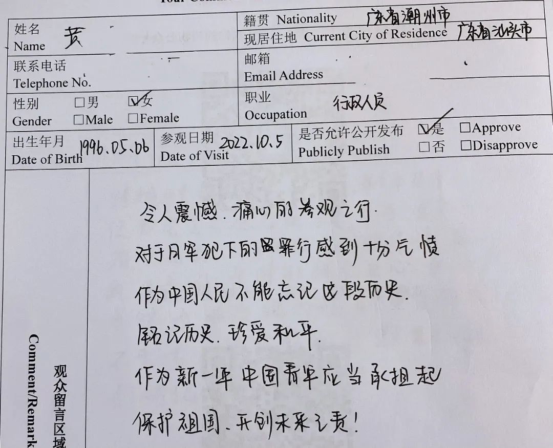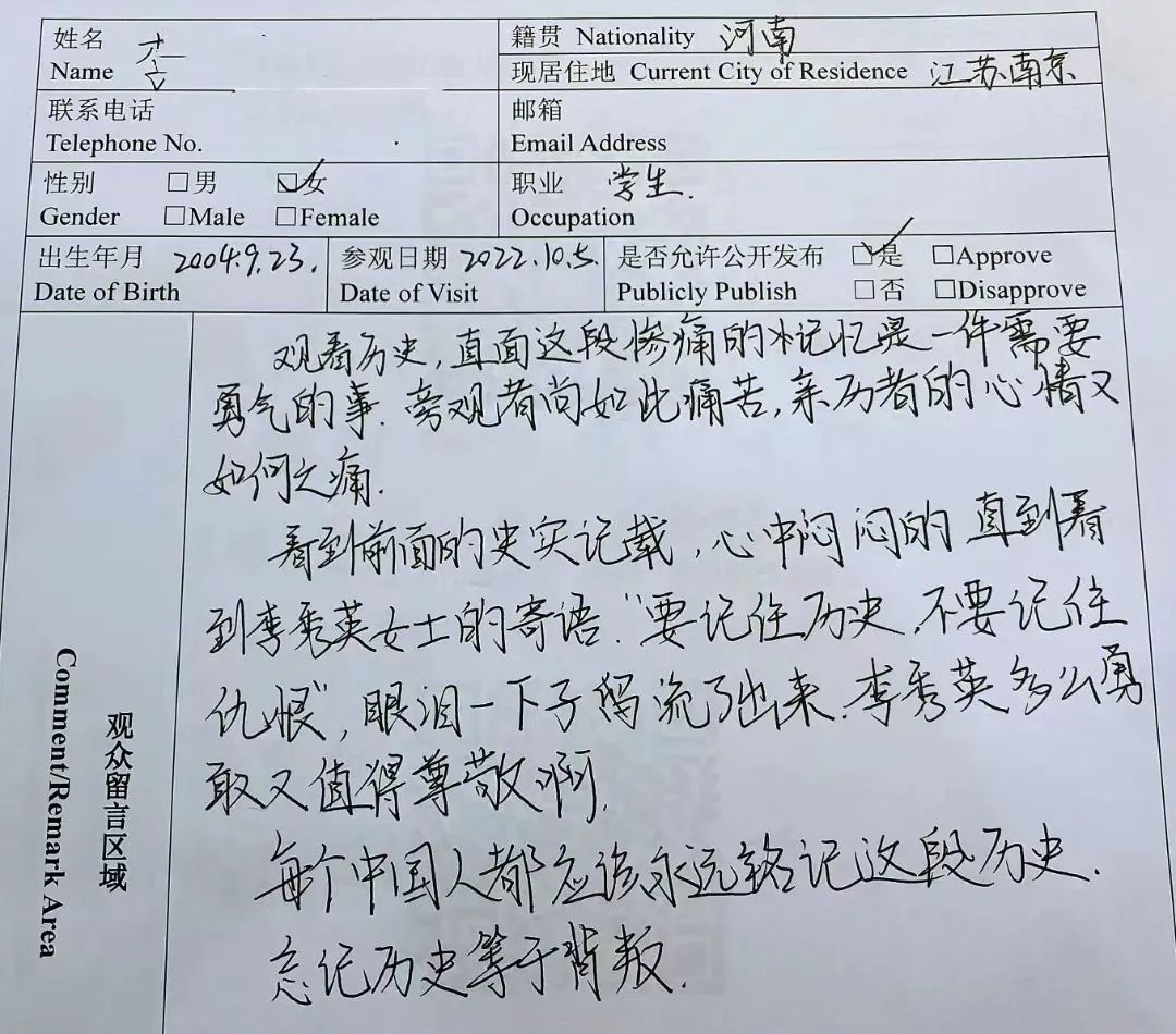 “令人震撼、痛心的参观之行,对于日军犯下的罪行感到十分气愤,作为中国人民不能忘记这段历史。铭记历史,珍爱和平,作为新一代中国青年应当承担起保护祖国、开创未来之责!”