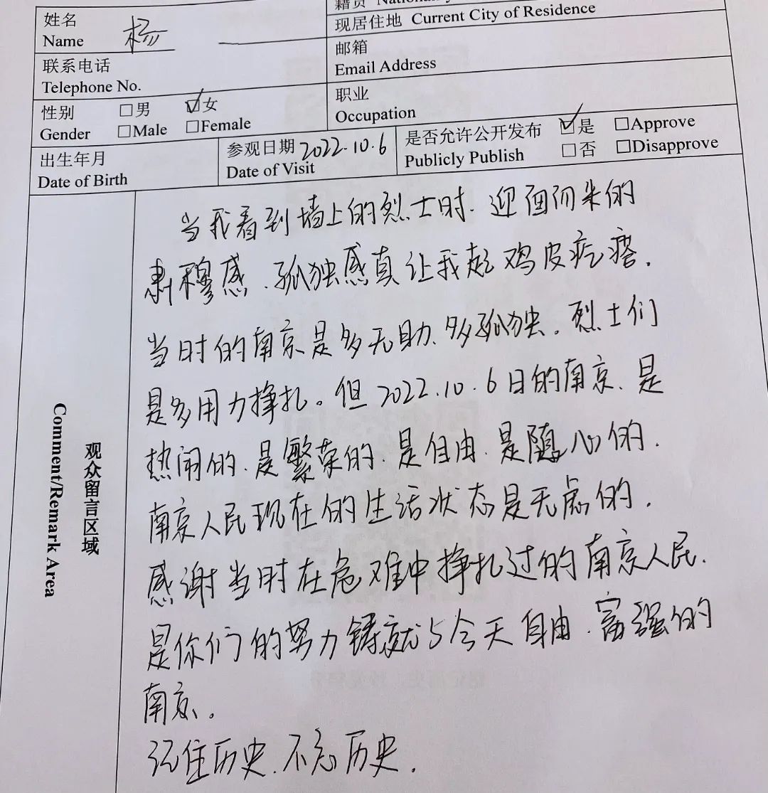 “当时的南京是多无助、多孤独,烈士们是多用力挣扎。但2022年10月6日的南京是热闹的、繁荣的、自由的、随心的,南京人民现在的生活状态是无虑的……”