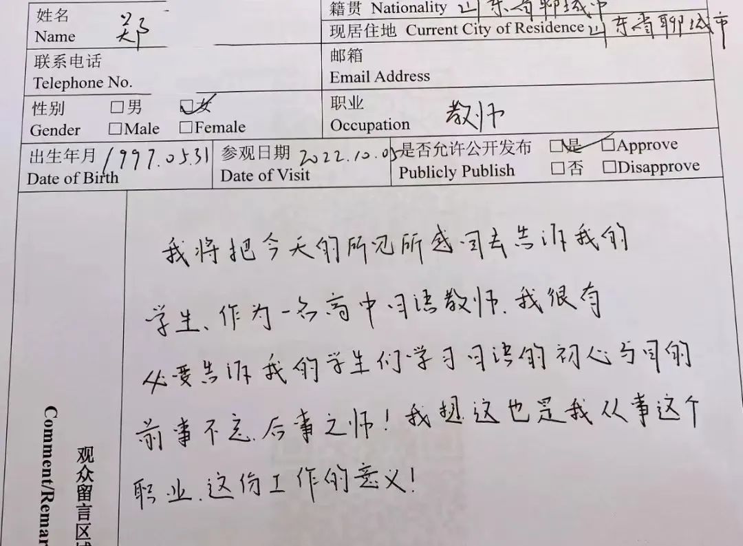 来自山东聊城的一名日语教师写道:“我将把今天的所见所感告诉我的学生。作为一名高中日语教师,我很有必要告诉我的学生们学习日语的初心与目的,前事不忘,后事之师!我想这也是我从事这个职业的意义!”