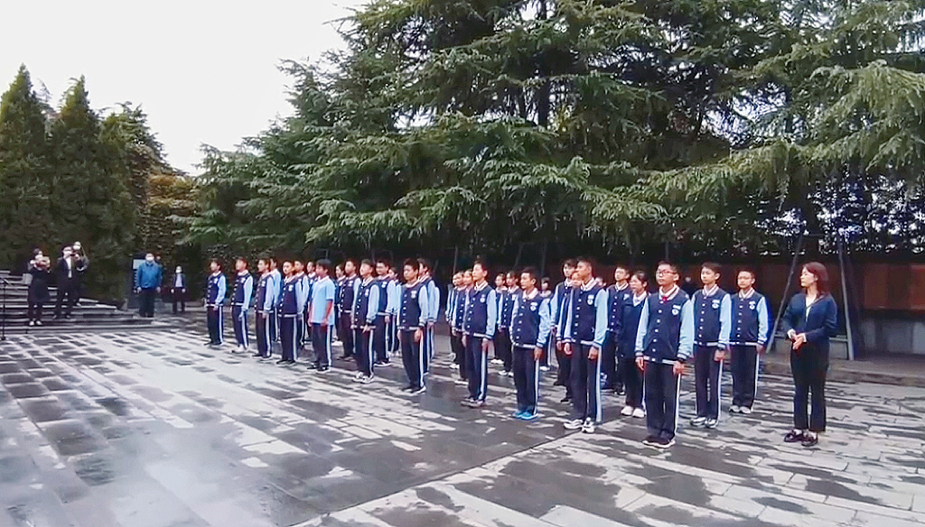国庆假期,南京玄武外国语学校八年级(7)班全体师生来到纪念馆参观学习。师生们在悼念广场向南京大屠杀死难者默哀、敬献花圈。学生代表王翼鸣说:我们要牢记历史,牢记那些英勇抗战、献出宝贵生命的英雄,珍惜现在来之不易的和平生活。”