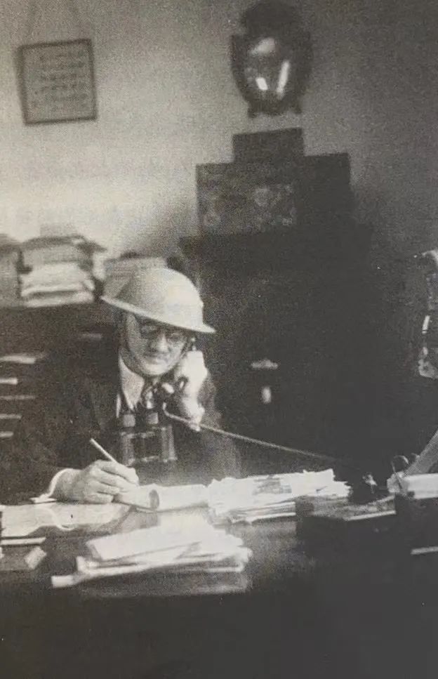 在日本飞机轰炸下,拉贝戴着头盔工作