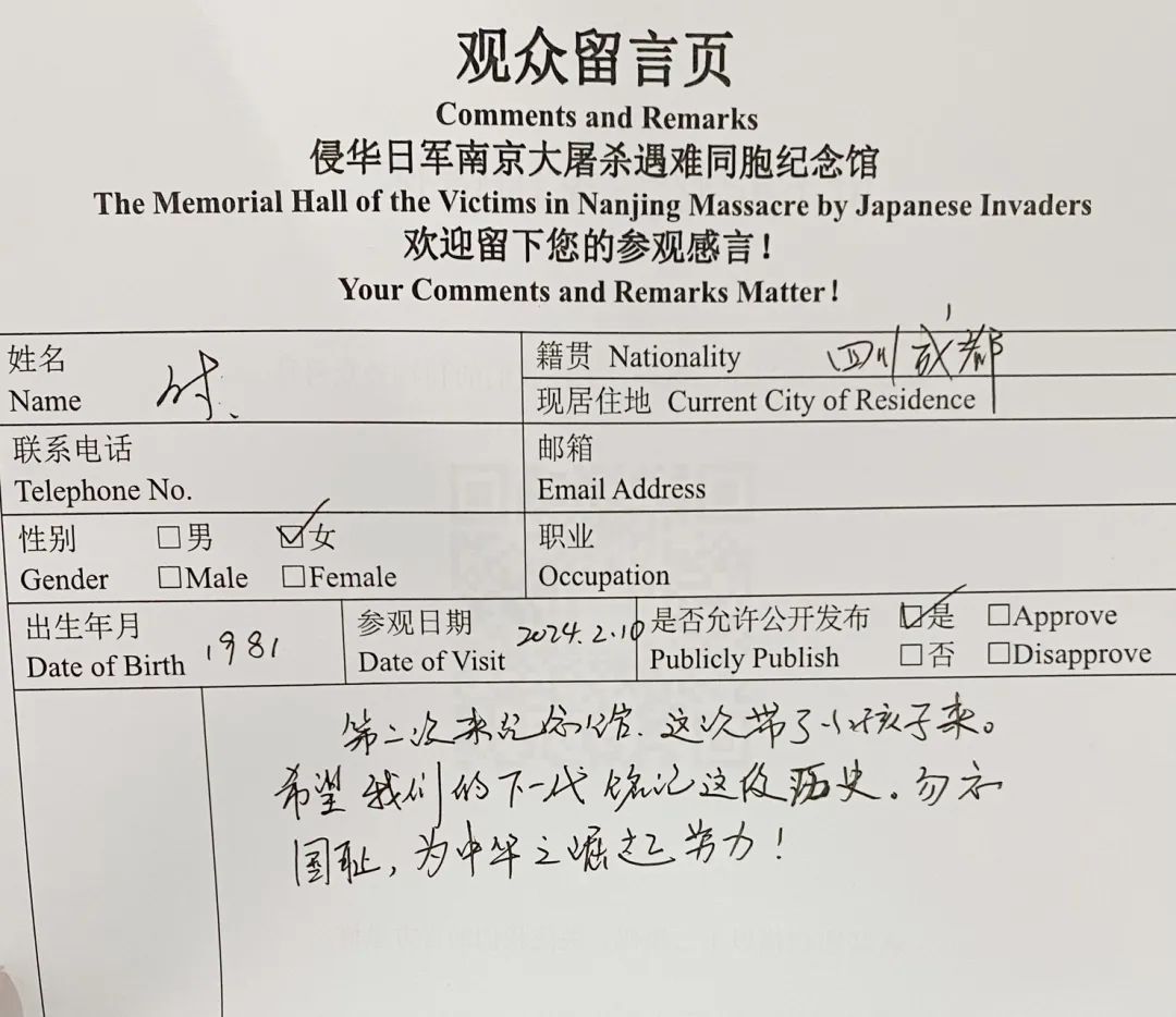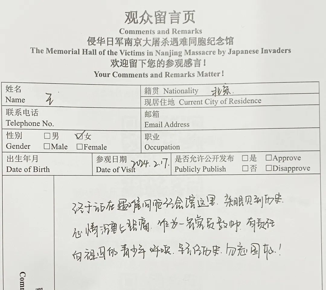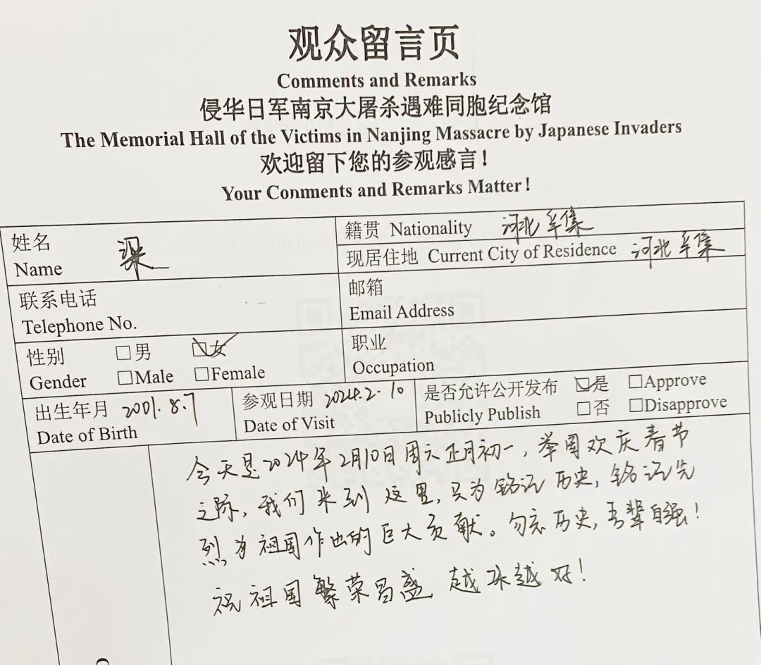 来自河北的观众写道:“今天是正月初一,举国欢庆春节,我们来到这里,只为铭记历史,铭记先烈。勿忘国耻,吾辈自强!祝祖国繁荣昌盛,越来越好!”
