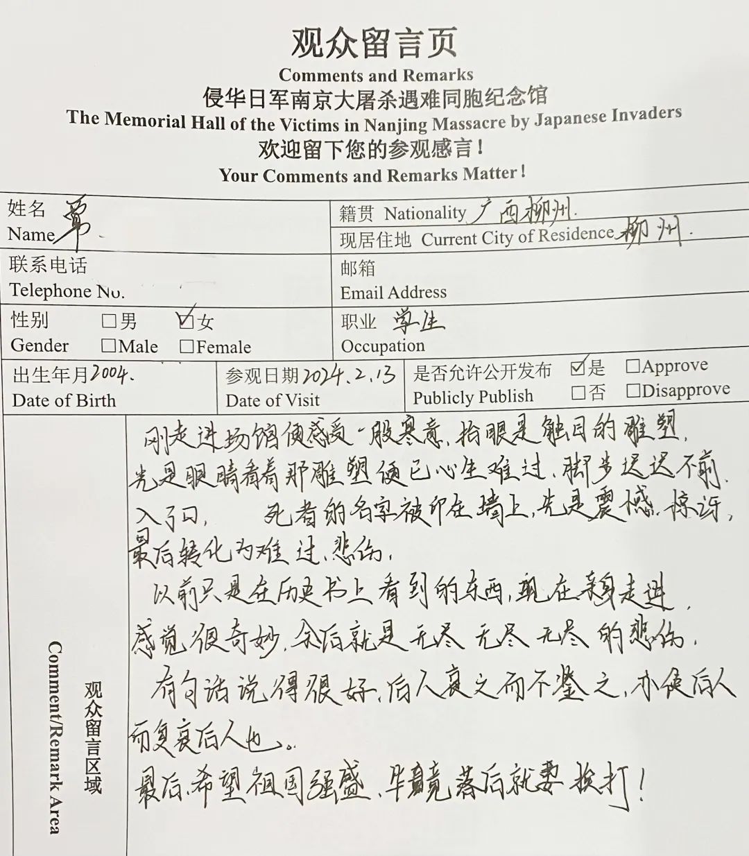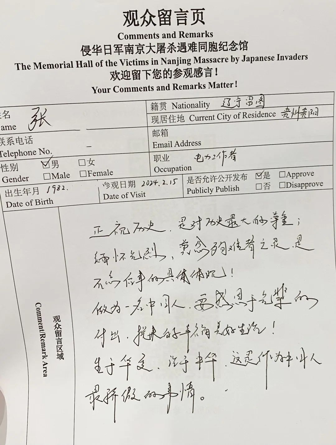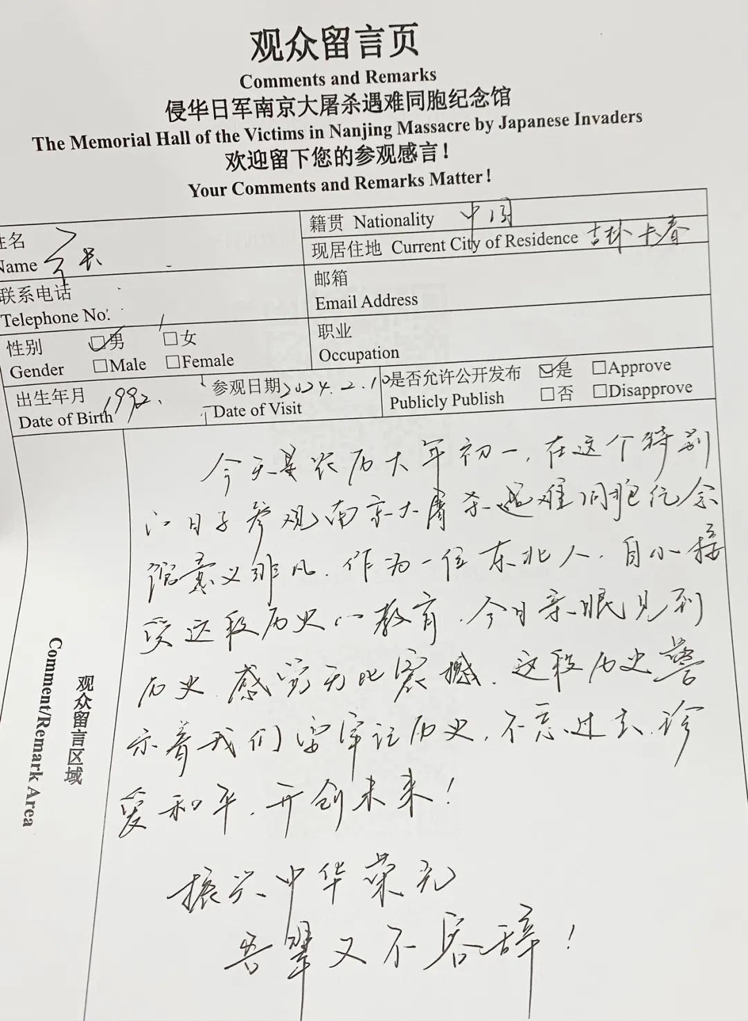 来自河北的观众写道:“今天是正月初一,举国欢庆春节,我们来到这里,只为铭记历史,铭记先烈。勿忘国耻,吾辈自强!祝祖国繁荣昌盛,越来越好!”