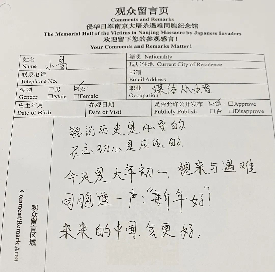 大年初一,许多观众走进纪念馆,把参观感受以书面留言的形式留在这里。一条条留言,写出了对南京大屠杀遇难同胞的思念与悼念,也写出了对祖国的美好祝福。