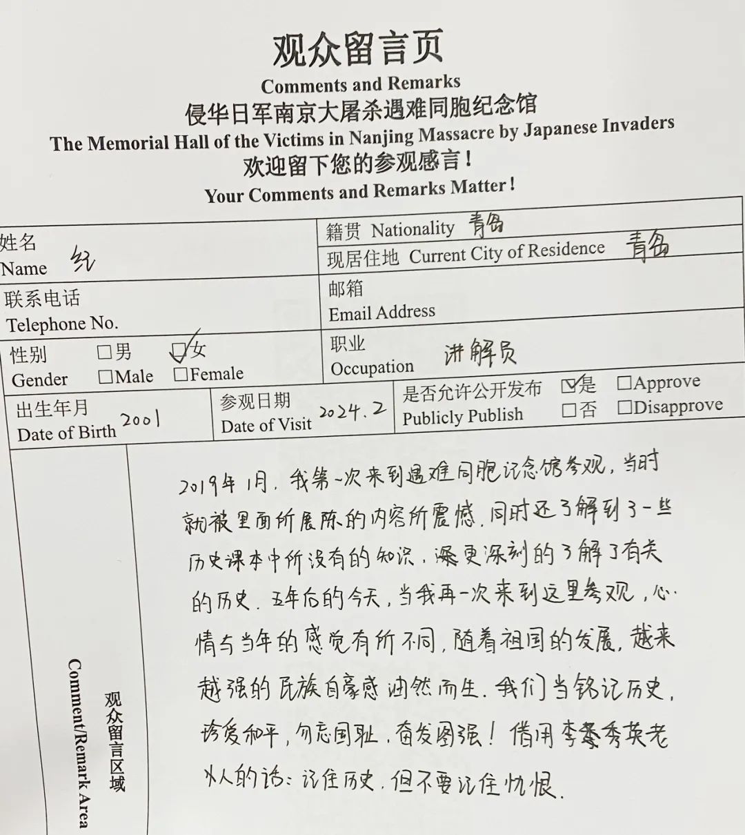 来自山东青岛的讲解员第二次来到纪念馆参观,她写道:“随着祖国的发展,越来越强的民族自豪感油然而生。”
