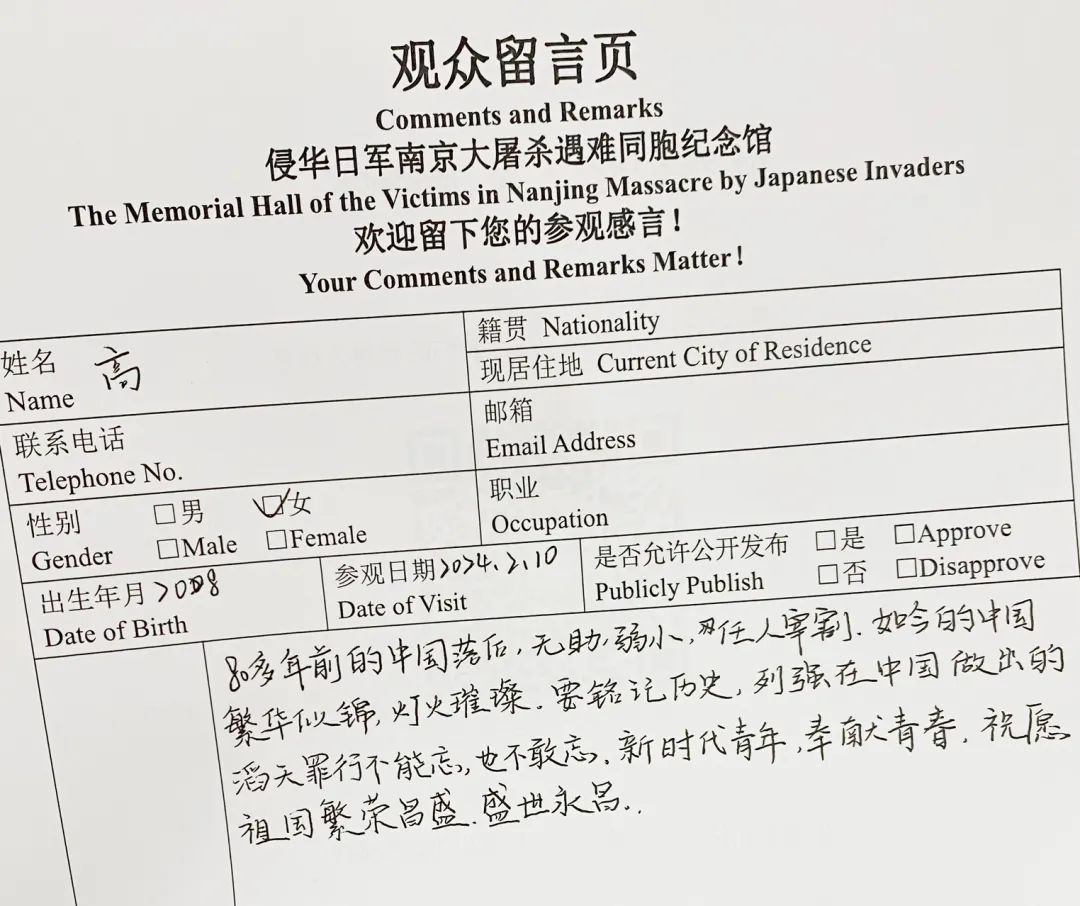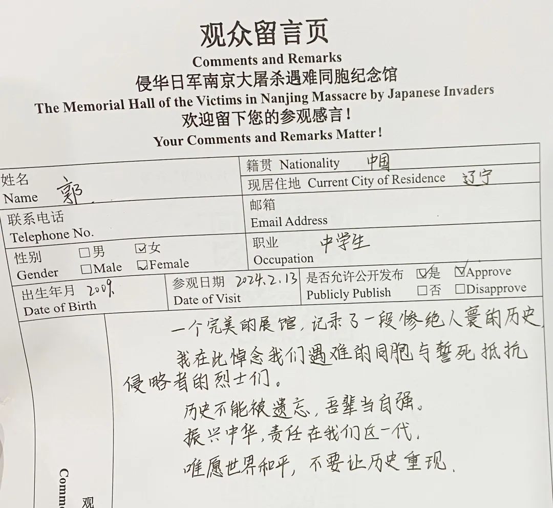 “一个完美的展馆,记录了一段惨绝人寰的历史。我在此悼念遇难同胞与誓死抵抗侵略者的烈士们。历史不能被遗忘,吾辈当自强。振兴中华,责任在我们这一代……”一名15岁的学生参观后在留言簿上写下这样一段话。在海量留言数据库中,如他一般的00后汇聚成一个庞大的留言群体。