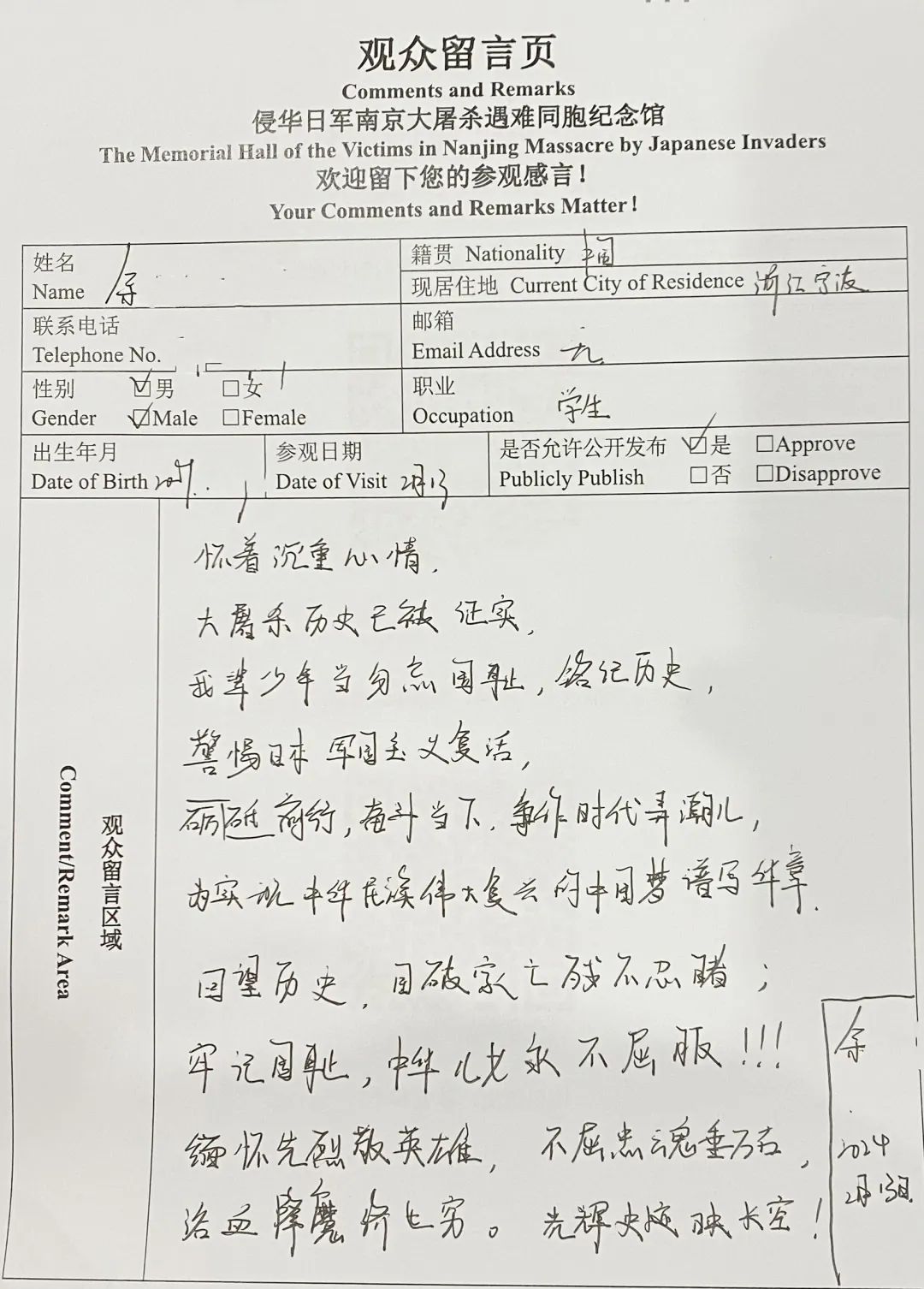 青少年观众在参观之后有了更多思考。“我辈少年当勿忘国耻,铭记历史,砥砺前行,奋斗当下,争做时代弄潮儿……”来自浙江宁波的余同学写下了这样的留言,笔迹清秀,情感炽烈。